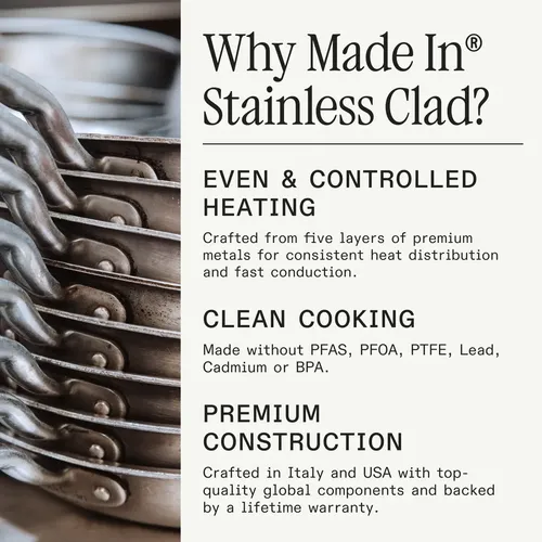 Get the professional performance of Stainless Clad in every size. Our Stainless Clad Frying Pan put us on the map and with this bundle, you get all three of our Award-Winning Frying Pans. Each Frying Pan is crafted from five layers of premium metals for optimized heat distribution and conduction. The long, Stay Cool Handle and relative light weight lets you move the pan around with ease.